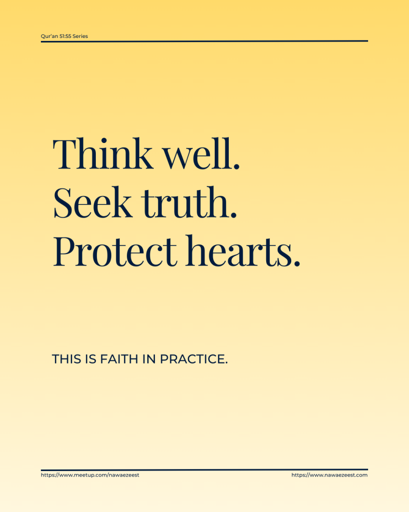 The Qur’an doesn’t just guide our actions — it corrects our thoughts. Allah warns us that some assumptions are sins, not harmless musings. Often, we think that faith is only about what we do outwardly, but Islam teaches that the heart is the starting point. Before words are spoken, before gossip spreads, before harm can take root, our thoughts are already shaping our character.